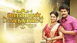 Ponmagal Vanthal (transl.Goddess of Wealth Appeared) is a Tamil-language family soap opera series starring Meghna Vincent, Vicky Krish, Shanoor Sana and Vandana Michael. It began airing on 26 February 2018 and ended on 1 February 2020 for 571 episodes on Vijay TV,[1] every Monday to Friday in an afternoon programming block called "Vijay Matinee Thodargal". Later the show was rescheduled to air Monday through Saturday.[2][3] The series marks the debut Tamil-language television series for Ayesha of Kerala, who plays the lead role; however she was replaced by Meghna Vincent after episode 105.[4] The series is directed by Gopal Shamugam.