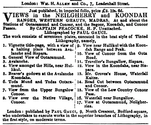 In May 1847, the imperial folio Koondah Ranges, Western Ghauts, Madras, at & about the Stations of Ootacamund and Conoor, and the Segoor, Koondah and Conoor Passes, with vignette title page and sixteen large (54 centimeters (21 in) x 38 centimeters (15 in)) plates after Peacocke was executed in the best style of tinted lithography printed on card stock, with added hand colouring, in contemporary half morocco leather binding with gilt spine for the price of £2, 12s. 6p.[18] The set was published by the lithographer, Paul Gauci, 9 North Crescent, Bedford Square, London.[19]