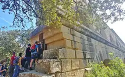 The Pont du Gard was constructed largely without the use of mortar or clamps. It contains an estimated 50,400 tons of limestone with a volume of some 21,000 m3 (740,000 cu ft); some of the individual blocks weigh up to 6 tons.[24] Most of the stone was extracted from the local quarry of Estel located approximately 700 metres (2,300 ft) downstream, on the banks of the Gardon River.[25][26] The coarse-grained soft reddish shelly limestone, known locally as "Pierre de Vers", lends itself very well to dimension stone production. The blocks were precisely cut to fit perfectly together by friction and gravity, eliminating the need for mortar.[11] The builders also left inscriptions on the stonework conveying various messages and instructions. Many blocks were numbered and inscribed with the required locations, such as fronte dextra or fronte sinistra (front right or front left), to guide the builders.[27]