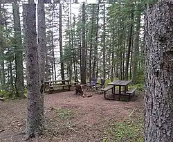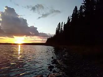 Woody River Recreation Site (52°28′45″N 101°42′03″W / 52.4791°N 101.7009°W / 52.4791; -101.7009)[18] consists of separate parcels of land plus additional Crown land centred around several lakes, Woody River, and Midnight Creek in the Porcupine Hills. Access is from Highway 980, which connects all of the lakes and amenities in the park, and by snowmobile. When travelling by snowmobile from the town of Hudson Bay, there are two warm-up shelters along the way.[19] Accessible lakes within the East Block include Isbister, Spirit, Smallfish, Woody, Elbow, and Townsend. All six lakes have boat access and fish commonly found in the lakes include walleye, perch, and northern pike. Campsites and picnic areas exist at Spirit, Isbister, Smallfish, and Townsend Lakes.[20] A rough ATV trail begins at the Spirit Lake Campground and heads north-east past Spirit Mountain and goes to Armit Lake, which is the largest lake in the Porcupine Hills.