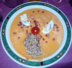 Porra antequerana is a part of the gazpacho family of soups originating in Andalusia, in southern Spain. Porra antequerana consists of tomato and dried bread. As it is much thicker than its culinary cousins, gazpacho and salmorejo, it is more commonly served as tapas, not soup. Like all soups in this family, there can be variations on the recipe. The word 'Antequerana' derives from the town of Antequera.[1] Porra is a type of club or truncheon and the use of the word in the dish's name likely refers to its traditional preparation with mortar and pestle.