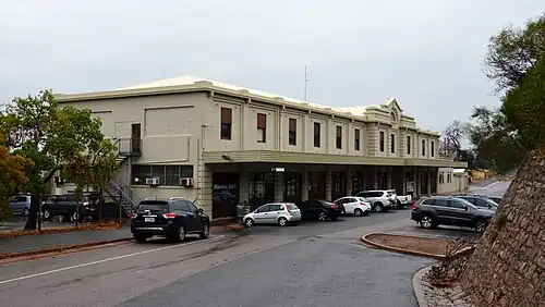 In 1878, the first railway line in to Port Augusta was when it became the southern terminus of a proposed line to Darwin. Under South Australian ownership the narrow gauge railway, known as the Great Northern Railway, was extended in stages and reached Oodnadatta in 1891.[1] In 1882, this line also connected Port Augusta to Adelaide when the Peterborough–Quorn railway line was completed, as there was already railway from Peterborough to Adelaide.[2] The original Port Augusta railway station was on Commercial Road, and is now heritage listed and used as an art gallery.[3] The railway continued through what later became railyards, through the original station, and down Commercial Road to the wharf area.[2]