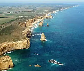 The Port Campbell National Park features an array of sheer cliffs overlooking offshore islets, rock stacks, gorges, arches, and blow-holes.[2] As part of the Shipwreck Coast,[6] it hosts several tourist attractions; including The Twelve Apostles, the London Bridge, Loch Ard Gorge, the Gibson Steps, and The Grotto.
