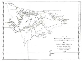 - ^ J. MacBride. A chart of Hawkins’s Maidenland, discovered by Sr. Richard Hawkins in 1574 and Falkland Sound, so called by Capn. John Strong of the Farewell from London who sailed through it in 1689. Scale 1:1000000. In: An account of the voyages undertaken by the order of His present Majesty for making discoveries in the Southern Hemisphere. Eds. J. Hawkesworth and J. Byron. Vol. I. London: W. Strahan and T. Cadell, 1773 (following p. 40)