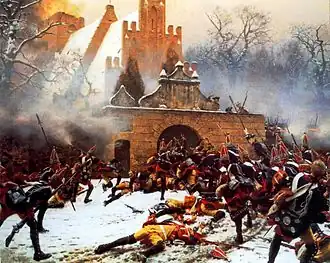 The battle was fought in and around the town of Leuthen (now Lutynia, Poland), 10 km (6 mi) northwest of Breslau, (now Wrocław, Poland), in Prussian (formerly Austrian) Silesia. By exploiting the training of his troops and his superior knowledge of the terrain, Frederick created a diversion at one end of the battlefield and moved most of his smaller army behind a series of low hillocks. The surprise attack in oblique order on the unsuspecting Austrian flank baffled Prince Charles, who took several hours to realize that the main action was to his left, not his right. Within seven hours, the Prussians had destroyed the Austrians and erased any advantage that the Austrians had gained throughout the campaigning in the preceding summer and autumn. Within 48 hours, Frederick had laid siege to Breslau, which resulted in the city's surrender on 19–20 December. (Full article...)
