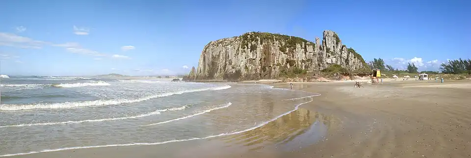 29°21′5.15″S 49°43′51.86″W / 29.3514306°S 49.7310722°W Guarita Beach is a Brazilian beach in the state of Rio Grande do Sul. It is a public resort that stretches along 23 kilometers on the coast the city of Torres. It borders with Santa Catarina and can be accessed through two roads, the BR-101 and the RS-389, which is the last road before reaching the sea. The city of Torres is 197 km far from Porto Alegre and 280 km far from Florianópolis. The beach is located between the "towers" (in fact volcanic plugs) the city is named after, and is flanked by the Morro das Furnas to the north and the Morro da Guarita to the south. It includes an environmentally-protected area, the Parque da Guarita.