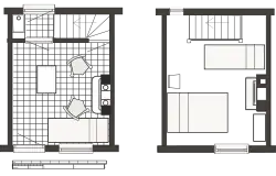 Some two-room cottages were as small as 10 feet (3.0 m) by 10 feet (3.0 m). Their narrow steep stairs aligned with the side or back wall. The heating was an open coal-fired cast-iron cooking range in the living room, and maybe a cast-iron 'register grate'[a] in the bedroom.[10]