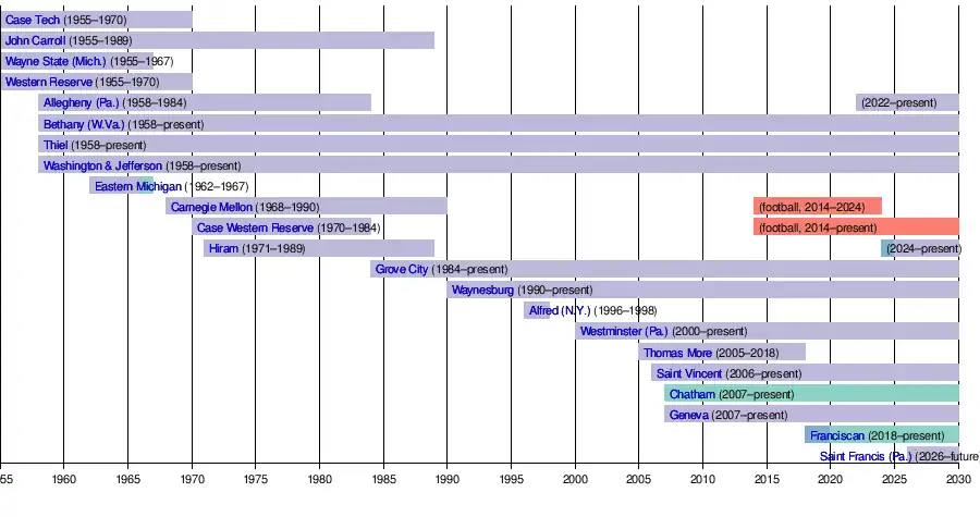 Some former PAC member institutions are Alfred University (1996–1998), Carnegie Mellon University (1968–1990), Eastern Michigan University (1962–1967) and Hiram College (1971–1989, returning in 2025).[2] On May 31, 2017, Thomas More College (University), announced its withdrawal from the PAC at the conclusion of the 2017–18 school year.[3]