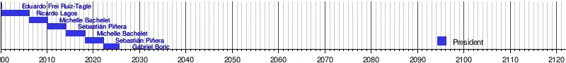 The timeline shows changes, both personal or title, of the head of state and the head of government of the Republic of Chile from 18 September 1810 until today, regardless of whether president, vice-president, supreme director, interim or junta.
