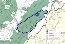 The boundary of the wildland, as determined by the Wilderness Society, is shown in the adjacent map.[1] Additional roads and trails are given on National Geographic Maps 788 (Covington, Alleghany Highlands).[3] A great variety of information, including topographic maps, aerial views, satellite data and weather information, is obtained by selecting the link with the wild land's coordinates in the upper right of this page.