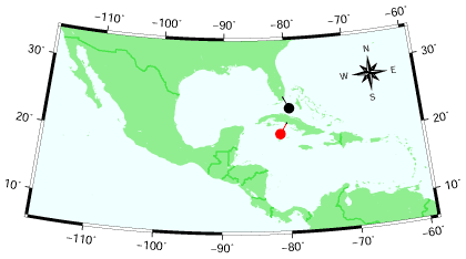 Fossil distribution of the pristine mustached bat. Pteronotus pristinus - red (Trinidad, Cuba), P. cf. pristinus - black (Monkey Jungle, Florida, USA).