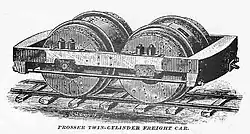 The Prosser Twin Cylinder freight car was intended to revolutionize the transport of grain by carrying it in two enormous iron cylinders about 8½ feet long and 6½ feet in diameter, each revolving on an axle running through its center, at the ends of which were the journal boxes. Effectively, the car would possess no superstructure, and instead the cargo would be carried inside the car's axles themselves. Steel tires, flanged and fitted to the gauge of track, were put around the cylinders, which served as the wheels of the car.[1] The Westinghouse Air Brake Company developed a system of air brakes specifically for this type of freight car.[4]