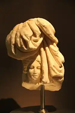 Prothyraia's means 'at the door' or 'at the door-way',[3] and is used to denote a goddess who presides over the area around the entrance to a building.[4] Prothyraia is an epiclesis of the goddesses Eileithyia, Hecate, and Artemis;[3] Prothyraia is attested as an epithet of Artemis in a 2nd-century AD inscription discovered in Epidaurus.[5] In Pausanias's Description of Greece, there is reference to a temple in Eleusis which was dedicated to Artemis Propylaia.[6]