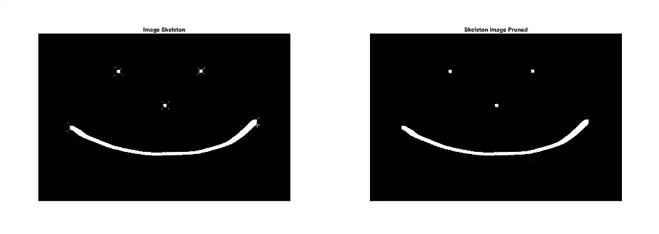 In the MATLAB example below, it takes the original image (below left) and skeletonize it 40 times then prunes the image to remove the spurs as per the MATLAB code above. As shown (below right) this removed the majority of all spurs resulting in a cleaner image.