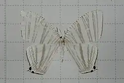 It is a white moth with black fasciations. Black dots are found on the tail margins of the hindwings.[5]