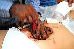 Psychic surgery is a medical fraud in which practitioners create the illusion of performing surgery with their bare hands and use sleight of hand, fake blood, and animal parts to convince the patient that diseased lesions have been removed and that the incision has spontaneously healed.[1][2][3] The technique may fool the general public, but it can be observed by experienced stage magicians, who use the same sleight of hand techniques for entertainment.[1]