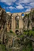 The construction of the newest bridge (the one standing as of 2024) was started in 1759 and took 34 years.[1] There is a chamber above the central arch that was used for a variety of purposes, including as a prison. During the 1936–1939 civil war both sides allegedly used the prison as a torture chamber for captured opponents, killing some by throwing them from the windows to the rocks at the bottom of the El Tajo gorge.[2] The chamber is entered through a square building that was once the guard-house. It now contains an exhibition describing the bridge's history and construction.
