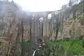 The Puente Nuevo (Spanish pronunciation: [ˈpwente ˈnweβo], "New Bridge") is the newest and largest of three bridges that span the 120-metre-deep (390 ft) chasm that carries the Guadalevín River and divides the city of Ronda, in southern Spain. Completed in 1793, the architect was José Martin de Aldehuela and the chief builder was Juan Antonio Díaz Machuca.