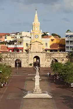 The Puerta del Reloj (pronounced [ˈpweɾta ðel reˈlox]), Torre del Reloj (pronounced [ˈtore ðel reˈlox]) or Boca del Puente (pronounced [ˈboka ðel ˈpwente]) is the main city gate of the historic center of Cartagena de Indias, in Colombia and the original entrance of the fortified city. It is located between the squares Plaza de Independencia and Plaza de los Coches. The name "Puerta del Reloj" responds to the clock with which it was crowned at the beginning of the 18th century. While the name of Boca del Puente is due to the fact that during the colonial period, a drawbridge was raised at the foot of the channel of San Anastasio, which linked the walled city to the legendary Getsemaní neighborhood. In addition the bridge served like defense of the city, since in case of enemy attack, this one was raised to prevent the access of buccaneers and pirates.