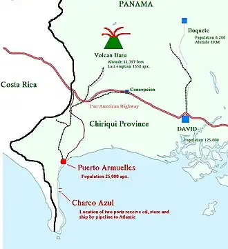 Puerto Armuelles is a city and corregimiento on Panama's Pacific coast in western Chiriquí Province adjacent to Costa Rica. It is the seat of the Barú District[1] and the second-largest city in Chiriqui province with a population of nearly 25,000. Puerto Armuelles has two different types of deep-water ports, one for bananas, and one for oil.