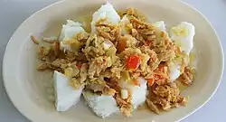 Many of the arrowroots and root vegetables used in Puerto Rican cuisine, collectively known as viandas, have their roots in the diets of the indigenous Taíno people.[12][13] These include cassava (Spanish: yuca) and three kinds of tannier (Spanish: yautía)[14] which are staples in traditional Puerto Rican dishes.[15] Other popular root vegetables include sweet corn root (Spanish: lerén), sweet potato (Spanish: batata mameya), celeriac (Spanish: apio criollo), white sweet potato (Spanish: batata; this potato has purple skin and white flesh) and yambee (Spanish: yambi), all of which are cultivated in the mountain regions of the island.[16][17]