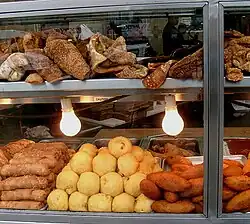 In New York City, cuchifritos or cochifritos refers to various fried foods prepared principally of pork in Spanish and Puerto Rican cuisine. In Spain, cuchifritos are a typical dish from Segovia in Castile. The dish consists of pork meat fried in olive oil and garlic and served hot. In Puerto Rican communities in New York City they include a variety of dishes including morcilla (blood sausage), papa rellena (fried potato balls stuffed with meat), and chicharrón (fried pork skin), and other parts of the pig prepared in different ways. Some cuchifritos dishes are prepared using plantain as a primary ingredient. Cuchifritos vendors also typically serve juices and drinks such as passionfruit, pineapple, and coconut juice, as well as ajonjolí, a drink made from sesame seeds.[34][35][36]