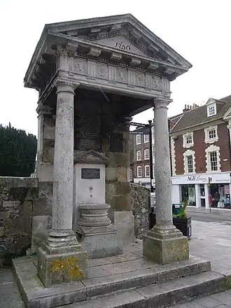 On 4 June 171, a fire destroyed almost the entirety of the town of Blandford Forum. Around 15 people were killed and over 90% of the town's buildings razed.[1] Rebuilding of the town was led by the Bastard brothers, John and William, who worked as builders and architects in the town.[2] John Bastard designed and paid for the monument which was erected in 1760.[a][3] It was sited above a spring, to provide a water source in the event of a further fire. This was converted to a drinking fountain in 1899.[3]