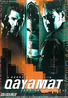 Qayamat: City Under Threat (transl.Judgement: City Under Threat), shortly called Qayamat, is a 2003 Indian Hindi-language action thriller film directed by Harry Baweja.[3][4] It stars Ajay Devgan, Sunil Shetty, Sanjay Kapoor, Arbaaz Khan, Isha Koppikar, Neha Dhupia, Riya Sen, and Aashish Chaudhary. It is a remake of the 1996 American film The Rock.[5][6] It was the first Indian film to be digitally colour corrected.[7] The film was shot in Australia, Mauritius and Diu.[8] It also marks the second collaboration between Devgn, Shetty and Baweja after Dilwale.[9]