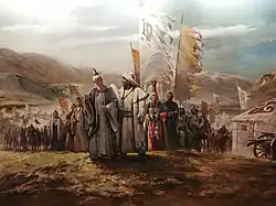 In 1219 Genghis Khan invited Changchun to visit him in a letter dated 15 May 1219 by present reckoning.[5][6] Changchun left his home in Shandong in February 1220 and journeyed to Beijing. Learning that Genghis had gone West, he spent winter there. In February 1221, Changchun left, traversing modern-day eastern Mongolia to the camp of Genghis' youngest brother Otchigin near Lake Buyur in the upper Kerulen – today's Kherlen-Amur basin. From there he traveled southwestward up the Kerulen, crossing the Karakorum region in north-central Mongolia, and arrived at the Altai Mountains, probably passing near the present Uliastai. After traversing the Altai he visited Bishbalig, modern Ürümqi, and moved along the north side of the Tian Shan range to Lake Sutkol, today's Sairam, Almaliq (or Yining City), and the rich valley of the Ili.[7]