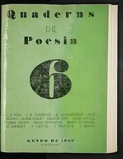 Quaderns de poesia (in English Poetry Notebooks) is a poetry Catalan magazine. Its publication started in June 1935 and continued until 1936 when it had to be interrupted due to the Spanish Civil War. In total 8 volumes were published monthly. It was directed by a staff including Josep Vicenç Foix, Tomàs Garcés, Marià Manent, Carles Riba and Joan Teixidor.[1] It was a high quality magazine regarding its presentation and its content. The magazine had 32 pages with 2 columns each and the dimensions were 240x185mm. The impression was done in Castells Bonet, S.A. and the editing office was in the Street Carrer de les Corts Catalanes 660 in Barcelona. The price was one and a half peseta.