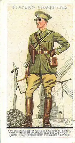 Player's cigarette card showing a captain of the Queen's Own Oxfordshire Hussars in field dress uniform in 1914. This figure is in uniform while deployed to France.