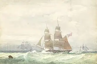 - ^ Schetky and Captain William Nisbet of Queen Charlotte were friends. Schetky made frequent summer voyages from London to Edinburgh aboard Queen Charlotte. In 1837, Schetky also made a water colour of the action when she repelled an attack by a French privateer.