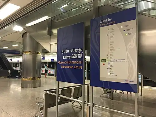 Queen Sirikit National Convention Centre MRT station (Thai: สถานีศูนย์การประชุมแห่งชาติสิริกิติ์, RTGSSathani Sun Kanprachum Haeng Chat Sirikit, code BL23) or QSNCC station is a Bangkok MRT station on the Blue Line, in Bangkok, Thailand. Located under Ratchadaphisek Road, near Queen Sirikit National Convention Centre, Benjakitti Park, PAT Stadium and Khlong Toei Market.
