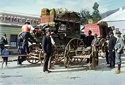 The station opened in November 1862.[4] By March 1863 more than 1000 people lived in the town and the police force consisted of an Officer, a Foot Sergeant, a Mounted Constable, eight Foot Constables, a Detective and four horses. There were also police officers at Arrowtown (7), Frankton (1), Arthurs Point (2) and Maori Point (1).[5] The Gold Escort was distinct from the police; contracted to Cobb and Co. Near Skippers and along the Shotover, branch escorts transported prisoners who were shackled to posts halfway along. The escort troopers were armed with carbines and swords. The Otago Daily Times reported that robberies were numerous and frequent drunkenness prevalent, with pick-pocketing complaints common. Claim jumping and stick-ups were also common. In 1867 there were police stations at Queenstown, Arrowtown, Frankton, Skipper's, Maori Point, Nevis, Nokomai and Cardrona.[6]