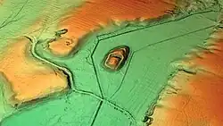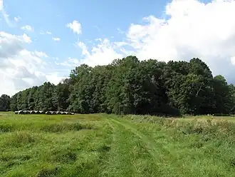 The Räuberberg is designated as a ground monument under the name Burg Deutsches Mittelalter. In the list of ground monuments, it is listed as number 90383 under "Görsdorf (B)".[6] As described in the Historisches Ortslexikon, it is approximately 2.2 kilometers west-southwest of the Angerdorf Görsdorf. This location is marked by the remains of the castle rampart of a noble castle and various discoveries dating from the 12th to 13th centuries, found on a hill to the north of Lake Drobsch.[7] While there were initial suppositions suggesting that it might have originated as a Slavic castle rampart or served as a Slavic princely seat, these conjectures have not been substantiated.[8][9][10]