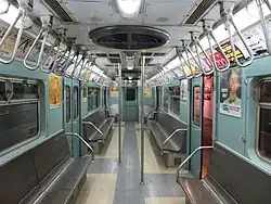 The R33S cars were numbered 9306–9345. The cars were very similar to the R33 cars, save for differently shaped side windows (three-piece curved windows on the R33S cars as opposed to three-sectioned rectangular windows on the R33 cars), and the fact that the R33S cars were single cars with a cab at both ends. The cars were built as single cars to make 11-car trains with the R36 cars for the 7, which were built as married pairs.[2]