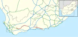 The R62 is a provincial route in South Africa that connects Ashton with Humansdorp. The R62 runs through the Little Karoo and the Langkloof, passing through Montagu, Ladismith, Calitzdorp, Oudtshoorn, and Joubertina.[1]