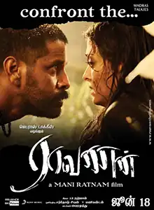 Raavanan is a 2010 Indian Tamil-language action-adventure film co-written, co-produced, and directed by Mani Ratnam. The film stars Vikram, Aishwarya Rai Bachchan and Prithviraj in the lead roles along with a supporting cast led by Karthik, Prabhu and Priyamani. It marked Rai Bachchan's return to Tamil after a decade, since Kandukondain Kandukondain (2000). The film follows the crux of the epic Ramayana, with a ruthless cop named Dev Prakash Subramaniam, who is on a quest to find a tribal leader-turned naxalite named Veeraiya as he had kidnapped his wife Raagini and begins to develop emotions for Veeraiya after learning his purpose.