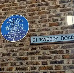 McMillan's reputation as a convert relies on a valedictory biography written about her by her sister in 1927. Margaret had been nursed through a severe illness by Rachel. Rachel and Margaret had lived together at lodgings at 51 Tweedy Road in Bromley, and there they entertained well-known people including Pyotr Kropotkin, the Lansburys, Margaret Llewelyn Davies, and the Countess of Warwick. In 2009 English Heritage had a blue plaque placed on this house in Bromley to record Margaret and Rachel lodging there.[4]