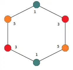 In graph theory, a branch of mathematics, a radio coloring of an undirected graph is a form of graph coloring in which one assigns positive integer labels to the graphs such that the labels of adjacent vertices differ by at least two, and the labels of vertices at distance two from each other differ by at least one. Radio coloring was first studied by Griggs & Yeh (1992), under a different name, L(2,1)-labeling.[1][2] It was called radio coloring by Frank Harary because it models the problem of channel assignment in radio broadcasting, while avoiding electromagnetic interference between radio stations that are near each other both in the graph and in their assigned channel frequencies.