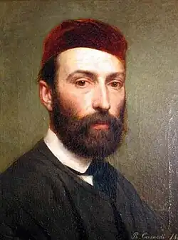 There, he studied drawing with Giuseppe Sogni, and painting with Luigi Sabatelli. As part of his instruction, he helped his teachers create frescoes at churches in Novara and Valmadrera.[1] In 1846, he painted two muses in the foyer of the Teatro di Mortara. He completed his studies in 1850.[2]