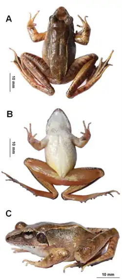 1. ^ a b Wu, Yanqing; Shi, Shengchao; Zhang, Huiguang; Chen, Weicai; Cai, Bin; Hoang, Van Chung; Wu, Jun; Wang, Bin (2021-10-26). "A new species of the genus Rana sensu lato Linnaeus, 1758 (Anura, Ranidae) from Wuyi Mountain, Fujian Province, China". ZooKeys (1065): 101–124. Bibcode:2021ZooK.1065..101W. doi:10.3897/zookeys.1065.67005. ISSN 1313-2970. PMC 8563708. PMID 34759715.