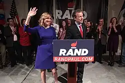 Paul officially announced his presidential candidacy for the Republican party on April 7, 2015, at the Galt House in Louisville, Kentucky.[61] His announcement featured several testimonials from supporters, and endorsements from prominent individuals, including former U.S. Congressman J. C. Watts, as well as his wife, Kelley who introduced her husband.[61] At the conclusion of his speech, Paul stated, "To rescue a great country now adrift, join me as together we seek a new vision for America. Today I am announcing, with God's help and with liberty lovers everywhere, that I am putting myself forward as a candidate for President of the United States."[62] Within a day of his announcement, Paul raised $1 million, slightly outpacing fellow Republican presidential candidate Ted Cruz.[63] However, Paul also faced a $1 million ad campaign against him, criticizing his foreign policy views.[64] Paul was also criticized for having heated exchanges with the press. Paul is known for being accessible to the media but he admitted in an interview on CNN to being "short-tempered" with the press.[65]