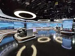 ![]() Rapport studio in December 2019; the unmanned desk, closer to the camera, is used to host Aktuellt from the same studio. | |