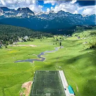 Stadium Ravni Žabljak with mountain Durmitor behind
