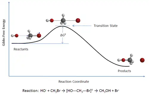 Reaction coordinate diagram for the bimolecular nucleophilic substitution (SN2) reaction between bromomethane and the hydroxide anion