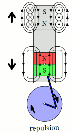 The armature may be a permanent magnet, in which case the coil or coils can exert both repulsive and attractive force on the armature. If there are two coils, they will be wound and connected so that their like poles face each other, so that when (for example) the poles facing the armature are both negative, one pole will attract the armature's south pole while the other will repel its north pole. When the armature reaches the extreme of its movement, polarity to the coils is reversed.