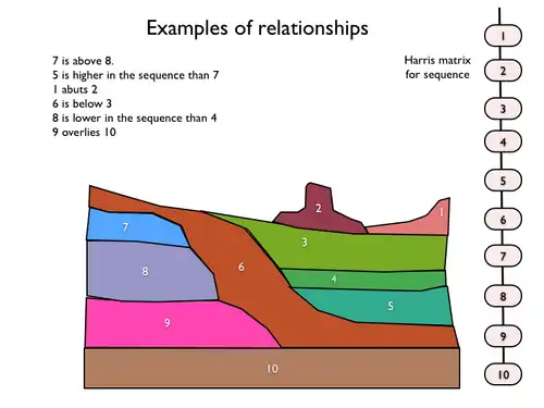 A relationship that is later in the sequence is sometimes referred to as "higher" in the sequence and a relationship that is earlier "lower" though the term higher or lower does not itself imply a context needs to be physically higher or lower. It is more useful to think of this higher or lower term as it relates to the contexts position in a Harris matrix which is a two dimensional representation of a sites formation in space and time.