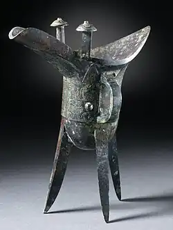 Non-living sacrificial offerings were mainly bones, stones and bronzes. Some of the bone products were shaped into hairpins or arrowheads, and there are instances of ivory found in elite tombs.[176][177] Stone objects such as jade were moulded into decorative ritual objects, such as those discovered in the Tomb of Fu Hao.[178][179] Offering ceremonies involved bronze vessels with short inscriptions, such as the ding (鼎), of which access seemed to be exclusively granted to the king and heirs partaking in rituals.[122][180][181] There were also accepted minor materials like ceramics, the designs on which were inherited from earlier cultures.[182][183]