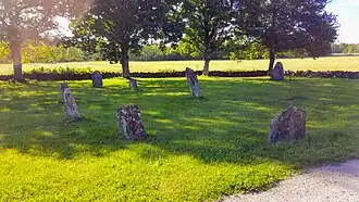 3. ^ "RAÄ-nummer Ljungby 29:1". Swedish National Heritage Board (in Swedish). Retrieved 14 June 2017. Skeppssättning, undersökt och restaurerad, 17x6 m (Ö-V), bestående av 7 resta stenar, 0,8-1,5 m h, 0,5-1 m br och 0,2-0,3 m tj. Vid undersökningen 1952 påträffades endast ett svagt utbildat brandlager i Ö delen. Vid restaureringen kompletterades skeppssättningen med tre stenar som låg i omedelbar närhet av vägen i Ö, så att det totala antalet nu är sju stenar. Enligt uppgift ska det ursprungliga antalet ha varit tolv. Tillägg dnr 321-834-2007: Lämningen återställd efter skador orsakade av stormen Gudrun.